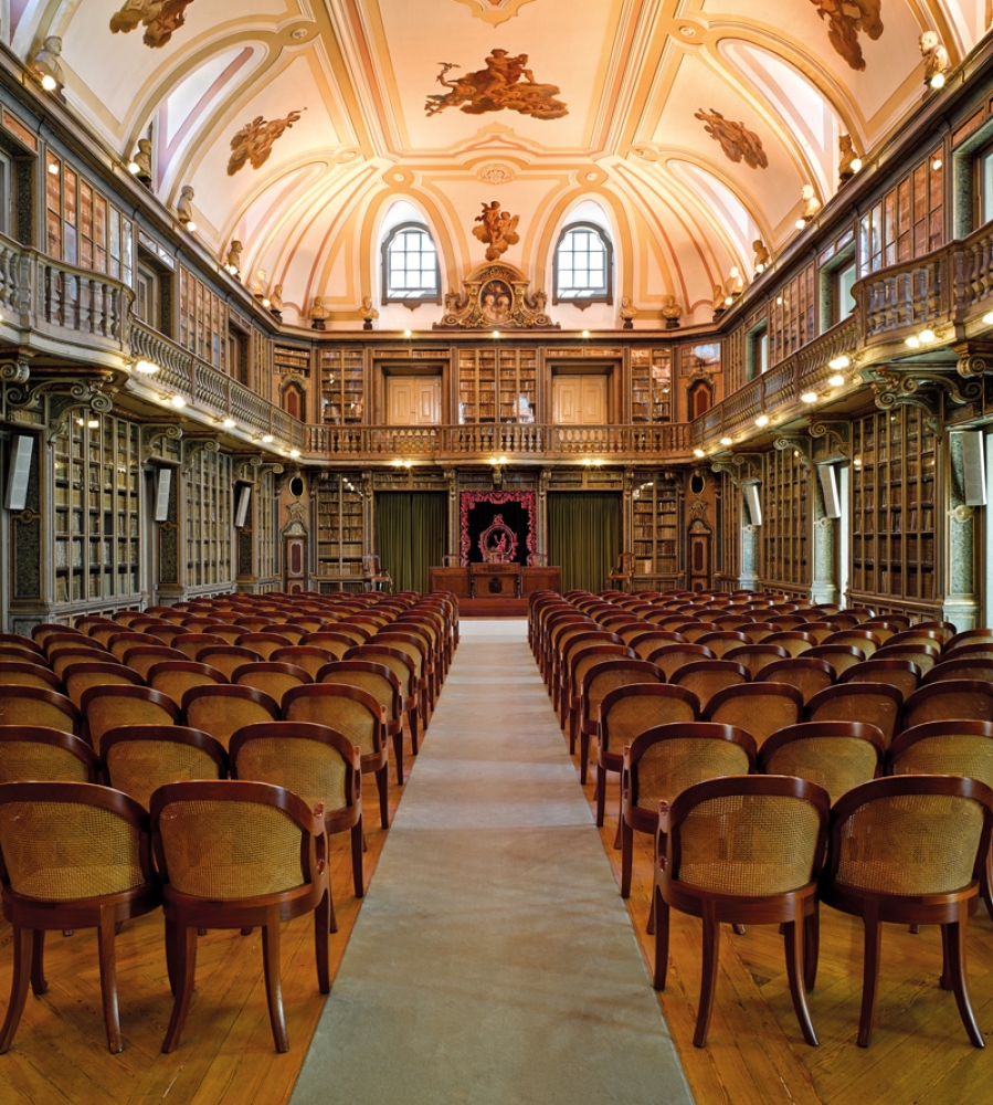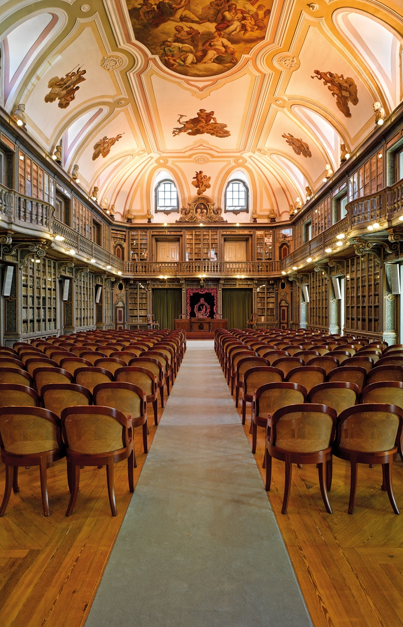 The institution’s emblem represents Minerva, the goddess of Wisdom and War, with the mercury rod and the shield with the Portuguese royal arms, under the inspiring sign of a verse by Phaedrus: ‘Nisi utile est quod facimus stulta est gloria’ [If what we do is not useful, glory is in vain], symbolising the alliance between knowledge and royal power.